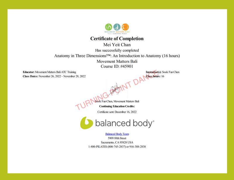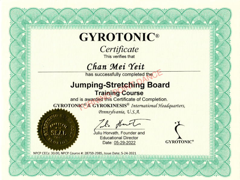 Ms. Chan has received her certification from POLESTAR® and GYROTONIC®. Ms. Chan is also a qualified instructor for Royal Academy of Dance (UK). She has attended various courses in Singapore, Bali, Shanghai and Hong Kong to enhance and learn new knowledge and skills.