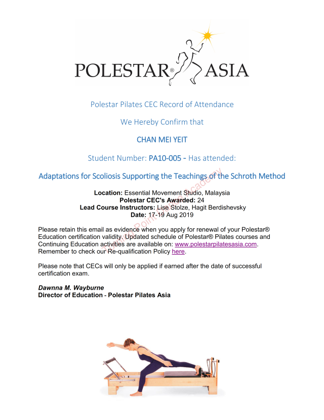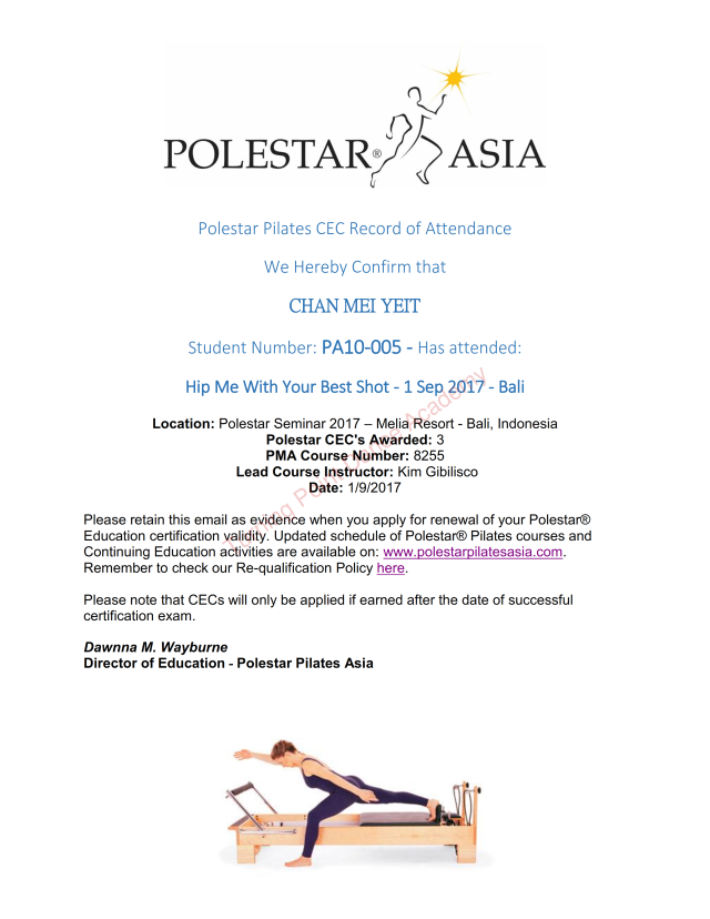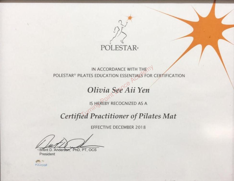 Ms. Olivia See has received her Pilates certification from POLESTAR® and she has attended OOV course in Sydney. She is also a qualified instructor for Royal Academy of Dance (UK).